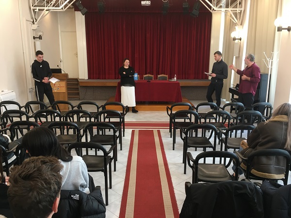 Sve je započelo ipak mnogo prije Grčke jer su nas g. Darko Kavain i gđa Nerma Kreso Kavain odveli pričom u doba Feničana objasnivši usput i kako je naš kontinent dobio ime, po Europi kćeri feničkoga kralja Agenora. Putem zanimljivih mitova stižemo polako do Tebe i rata između dva brata Eteokla i Polinika koji će se sukobiti zbog obnašanja vlasti u Tebi. Upravo su u tom trenutku nastupili i naši učenici Filip Peša i Grgur Grbin koji su uz pomoć Darka i Nerme uprizorili ulomak iz Euripidove verzije istoga mita kada između braće više nije bilo puta izmirenja nego jedino rata. U istoj su se takvoj ulozi i nešto kasnije našli Petar Barunčić i Luka Maraš. Pohvala hrabrim dečkima koji se nisu bojali izaći pred svima nama i pokazati nam svoj glumački talent.
