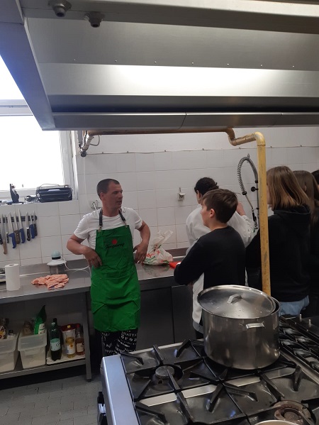 Došli smo i do zadnjeg dana kulinarskog tečaja, ali i svima nama najdražeg dana jer smo pripremali pizzu. Svi su već pomalo bili i tužni što je ovo zadnji dan jer smo se već naviknuli na novu aktivnost nakon škole. No, ipak se nismo žalili jer, osim što napravimo hranu, na kraju je i kušamo. Imali smo i novog gosta, Diadoru TV, koja je, osim što je snimala cijelu pripremu pizze, intervjuirala i učenike 1.c razreda o njihovim dojmovima. Zajedno smo pravili tijesto, umak, rezali sir i šunku, dok naposljetku nismo uočili da smo napravili malo previše pizza. No, nema veze jer se hranu nikad ne baca! Ovaj dan završili smo sa znakom zahvale kuharu od svih nas, tj. poklonom po kojem ćemo mu ostati u sjećanju. Zahvalni smo na svim novim podatcima i iskustvu koje smo stekli i naučili te se nadamo da ćemo u budućnosti imati više ovakvih prilika.