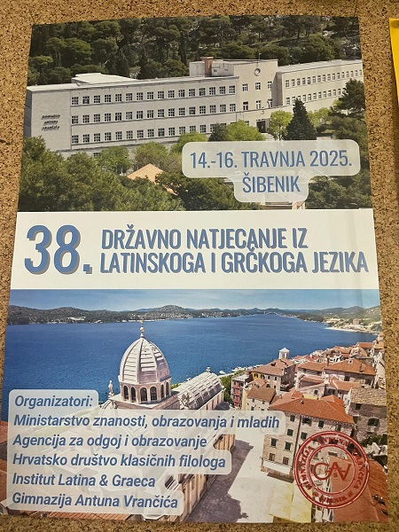 38. državno Natjecanje iz latinskoga i grčkoga jezika održano je 14. do 16. travnja 2025. godine u Šibeniku u Gimnaziji Antuna Vrančića. Naša učenica Paula Erceg bila je prva na županijskom natjecanju i u grčkom i u latinskom jeziku. Pozvana je na državno Natjecanje iz grčkoga jezika i pod mentorstvom profesorice Tee Radović, učenica je osvojila 10. mjesto u kategoriji klasičnih gimnazija. Njihov trud i rad se isplatio, na natjecanju su uživale u prekrasnom Šibeniku družeći se s ostalim natjecateljima i mentorima, a mi im od srca čestitamo na pokazanom znanju!
