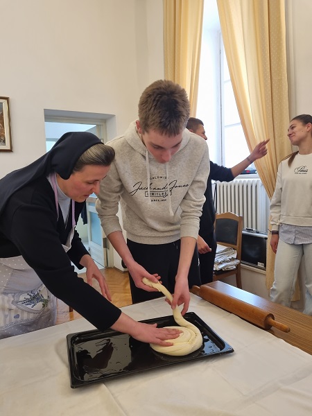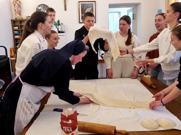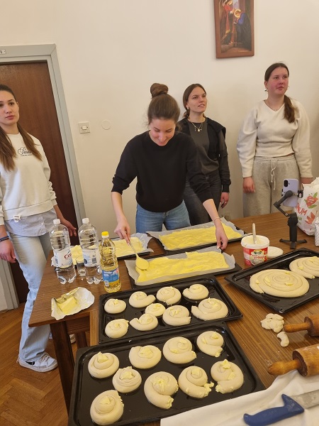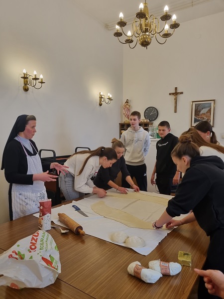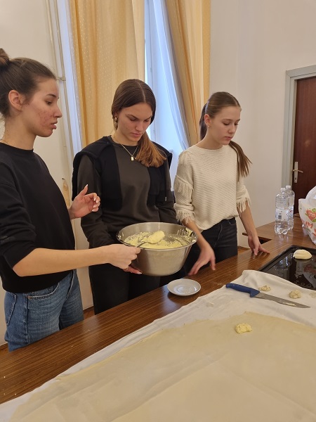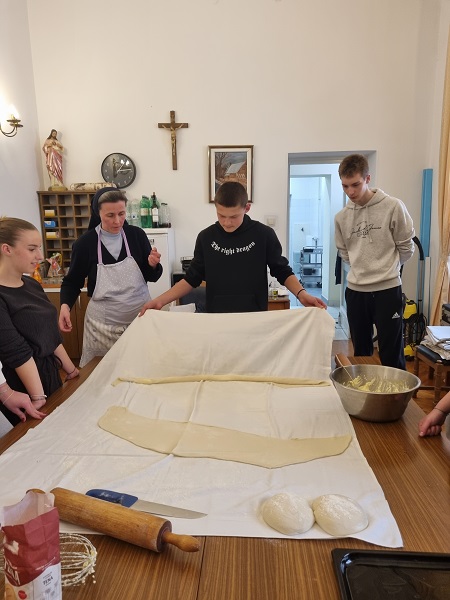 Ideja o pečenju pita rodila se prošle godine. Kako naša pedagoginja s. Ana Lipovac dolazi iz kraja koji je u gastronomiji poznat po izvrsnim pitama, odlučili smo njeno znanje prenijeti na učenike Andreu Uhodu, Zaru Medanić, Luciju Valčić, Klaudiju Gulan, Paulu Supičić, Tamaru Kevrić, Zvonimira Šimičevića, Adriana Vukića iz 2. b razreda te Janu Klarin, Antoniju Birkić, Noelu Bralu i Gabriellu Colić iz 2. c razreda i profesoricu matematike Sanju Hanžek Bačkov.