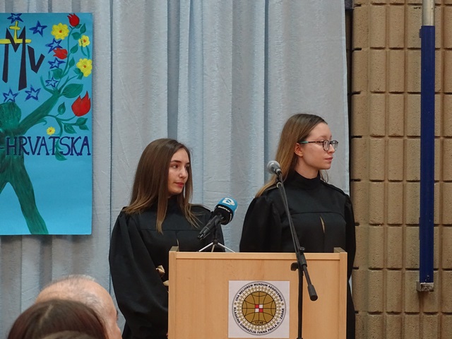 Recital »Priča o mostovima« pogledali smo u izvođenju dvojice učenika drugog razreda Katoličke osnovne škole Ivo Mašina: Šimuna Gudelja i Šimuna Vulića. Priča nas vodi u daleki San Francisco, grad poznat po svojim mostovima od kojih je najslavniji Golden Gate. Jednom se dogodilo nešto neobično – neki je čovjek platio mostarinu za sebe, ali i za stranca koji naiđe iza njega. Uskoro je i naišao i drugi čovjek, no »mostarnik« mu je rekao kako je za njega mostarina već plaćena te da on plati za nekog drugog. Tako je i bilo! Krenula je lančana reakcija dobrih djela, a ona uopće i ne trebaju biti velika kako bi nekoga usrećili. Nakon motivirajuće priče naših mališana, ravnatelj Klasične gimnazije, don Ante Sorić održao je kratki govor dobrodošlice za naše goste.
