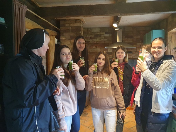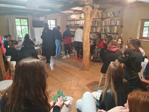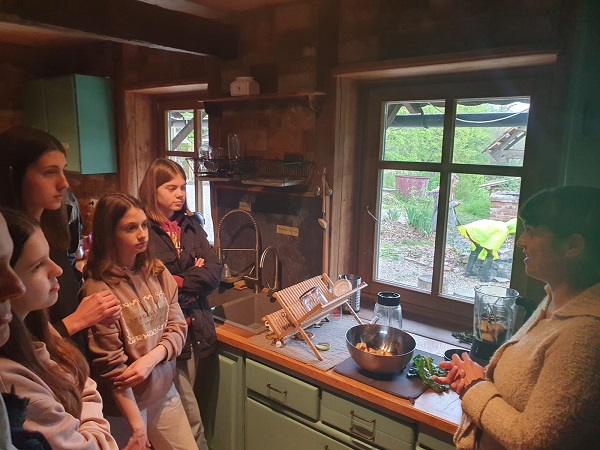 Nakon kratkog razgledavanja počeli smo s prvom radionicom koju je održavala Matea, predsjednica njihove udruge. Ona nas je upoznala s pojmovima o kratkim lancima opskrbe i lokalnim proizvodima. Došao je red na nas koji smo s dobivenim karticama trebali osmisliti cjelovite obroke. Htjela nam je pokazati primjer zdravog obroka, ali zbog nezgode s blenderom probali smo neuspjelu verziju „zelenog smoothiea“.