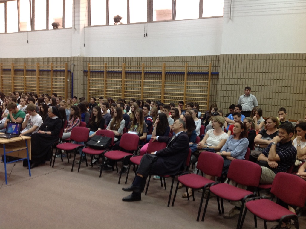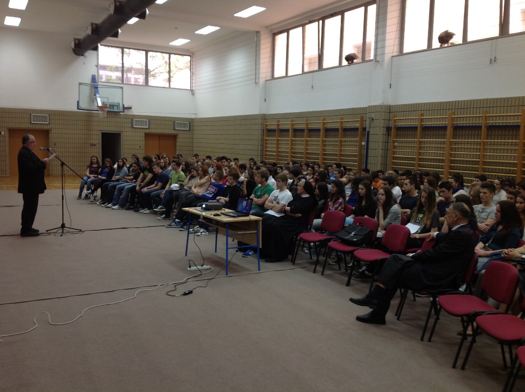 Predavanje pod naslovom Što je rodna teorija i čemu ona zapravo služi? učenicima prvih, drugih i trećih razreda naše Škole održao je prof. dr. Matko Marušić s Medicinskog fakulteta u Splitu. „Pozivanje na znanost u slučaju uvođenja ‘spolnog odgoja’ u hrvatske škole je prevara, jer tu znanosti nema“ – najkraći je sažetak njegovoga predavanja održanog u prepunoj športskoj dvorani Škole, 28. svibnja 2014. godine.