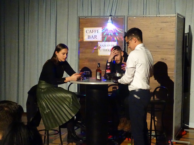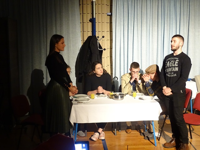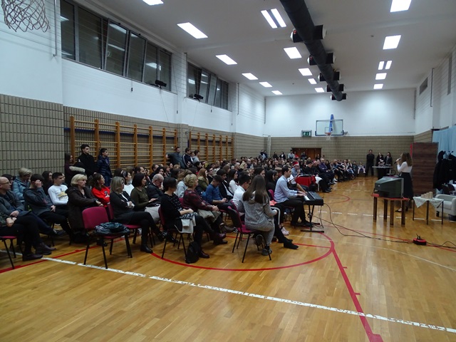 Voditelji Nika Radetić i Marin Galešić pozdravnim su riječima otvorili predbožićni susret te sigurno upravljali događajima i lijepo najavljivali sve točke. Večer je započela solo izvedbom pjesme Have Yourself a Marry Little Christmas učenice 2. razreda Stošije Tomaš, a nakon toga uslijedila je šaljiva, ali poučna predstava koju su pripremili naši učenici uz vodstvo Ane Raspović. Predstava Škola za obitelj daje nam primjer doma čiji se članovi pripremaju za Božić, ali svatko na svoj način. Baka i djed, kao i majka i otac očekuju da će Badnjak provesti tradicionalno s obitelji u toplini svoga doma dok s druge strane kći i sin taj dan planiraju provesti drugačije. Za njih je zajedničko ukrašavanje bora i pripremanje jaslica sporedna stvar, a prioritet im je ipak izlazak s prijateljima. U konačnici ipak shvaćaju da je bit Božića dočekati Krista u zajedništvu i toplini doma s obitelji, u radosti i veselju. Predstavu je dodatno uljepšala učenica 4. razreda Zrinka Mikulić solo izvedbom pjesme Kad sve utihne. Publika je gromoglasnim pljeskom nagradila glumce na kraju predstave i time potvrdila da ih se Škola za obitelj itekako dojmila. Navedimo sve njih poimence, zaslužili su: Ena Nekić, Stipe Gabrić, Zrinka Mikulić, Šimun Janjić, Sara Šarić, Berto Žuvić, Iva Jeličić, Anica Deša, Anđelina Bičić, Lucija Daniela Birkić, Elena Filipović, Matej Škara i Marko Pavlović.