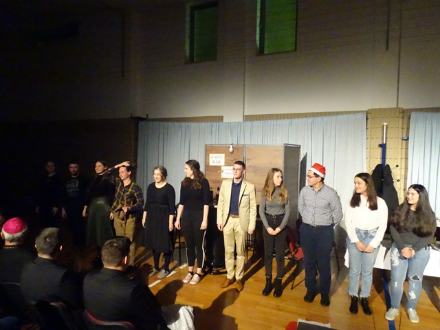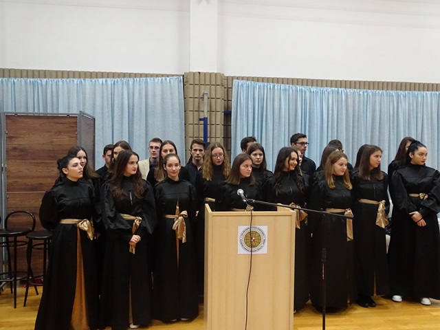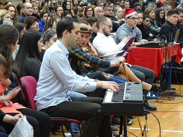 Nije bilo ni jednog predbožićnog susreta koji nije uveličao i školski zbor. Tako je bilo i ove večeri. Pod vodstvom profesora Grge Ivkovića raspjevani klasičari izveli su nam starohrvatsku pjesmu iz Bačke Oj pastiri čujte novi glas. Nakon nastupa zbora obratili su nam se ravnatelj don Ante Sorić i nadbiskup, mons. Želimir Puljić. Svoje obraćanje ravnatelj je započeo upečatljivim citatom: »Na Božić se nebo i zemlja zagrliše, Stvoritelj i stvorenje izmiriše, božansko i ljudsko sjediniše, sam Bog postade sin ljudske majke, a ljudska žena postade Božja majka. Svemoćni i vječni Bog, koji nadilazi svemir, rodi se kao nemoćno i smrtno dijete u jaslama«, a dovršio zahvalom svima koji su došli i onima koji su pomogli da se ova predbožićna večer održi. Otac Nadbiskup nam je, osvrnuvši se na predstavu, poručio da nastavimo primjerom same predstave i ne dopustimo da se Božić komercijalizira i izgubi svoj pravi smisao jer glavno je da se zajedno radujemo što je Isus došao. »Zašto je Isus došao u ovu našu dolinu suza punu problema? Došao je da oplemeni naš razum i srce da budemo ljudi i puni ljubavi, blago nama ako ga prihvatimo jer s njegovom pomoći možemo sve činiti!« naglasio je Otac Nadbiskup. Također je istaknuo snagu zajedništva i radosti koje ono donosi: »Zajedništvo je osnova te trebamo živjeti jedni za druge jer nikad nismo sami i kad smo kilometrima daleko u nečijim smo mislima.« Nakon kratkog govora udijelio nam je blagoslov, a prije samog kraja i humanitarne tombole, još jednom glazbenom točkom, počastio nas je učenik 4. razreda Stipe Gabrić pjesmom Sretan ti Božić narode moj. Eh, dragi čitatelji, tko nije bio u dvorani i svjedočio nadahnutom, uživljenom i čvrstom Stipinu nastupu, doista je mnogo propustio. Stipe je na kraju pozvao sve nas prisutne da zajedno s njime zapjevamo Radujte se narodi.