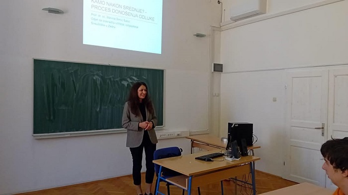 U sklopu Dana otvorenih vrata Odjela za izobrazbu učitelja i odgojitelja našu je školu posjetila profesorica Slavica Šimić Šašić i održala je korisno predavanje za maturante na temu ,,Kamo nakon srednje škole – proces donošenja odluke”.