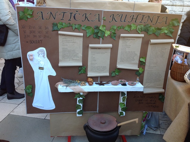 Uz pomoć naših vrijednih maturanata odnijeli smo sve potrebne „rekvizite za rad“. Nedugo nakon, po tko zna koji put relacije Škola- Trg, sve smo spremili te u daljini uočili vesele kolege iz Prehrambene škole kako ponosno prinose antičke slastice kao što su: žrtveni kruščići, grčki uštipci (za koje su prolaznici bili uvjereni da su fritule), kuglice s orasima i paprom, datulje ( kuhane u vinu i medu te punjene pinjolima) i grčke palačinke kojima su Grci započinjali dan.