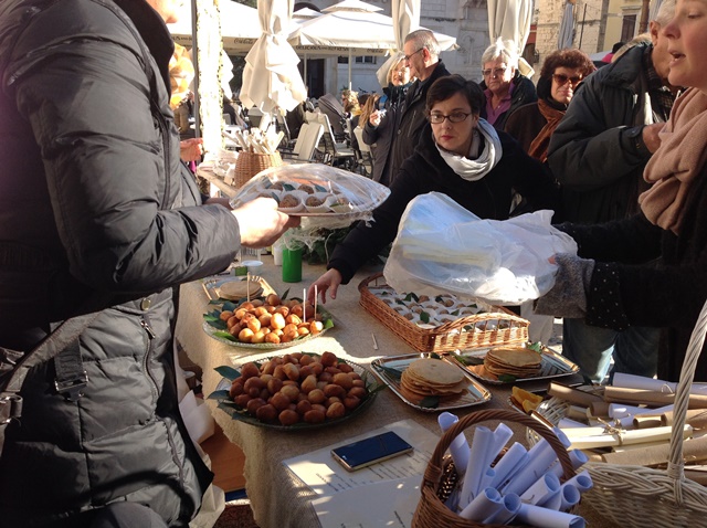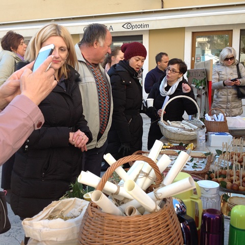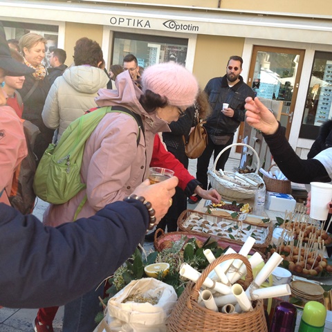 Spremivši sve, obukavši toge te postavivši lovorov vijenac na glavu dali smo jasan znak prolaznicima koji su oni odmah uočili te žurno prišli. Osim što su vidno uživali u antičkoj kuhinji, čaj (menta, ružmarin, kamilica, lavanda) im je dobro došao zbog izrazito niske temperature. No, mogle bismo mi „od jutra do sutra“ razglabati o hrani…