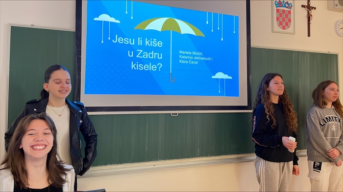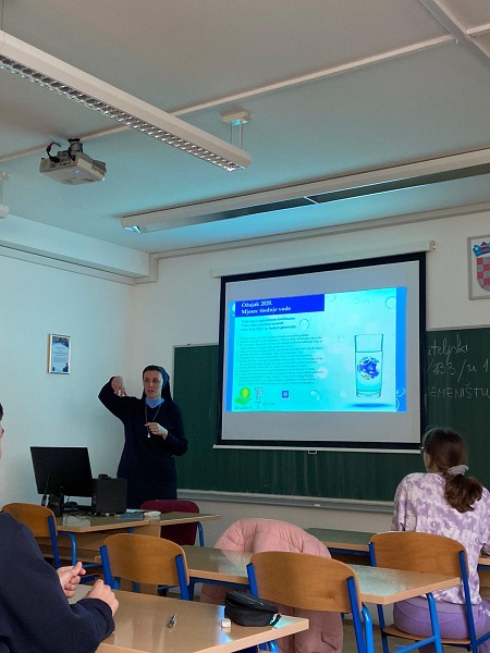 Voditeljica projekta profesorica biologije i kemije Željka Jadrošić s učenicima prvih razreda analizirala je kiselost kišnice na zadarskome području, s učenicima drugih razreda fizikalna i kemijska svojstva uzoraka naših prirodnih voda na Morskim orguljama i na Vruljici te s učenicima trećih razreda obilježila nadolazeći Svjetski dan voda posjetom Odvodnji d.o.o. Zadar gdje je naglašena važnost očuvanja prirodnih izvora vode, brige o pročišćavanju voda i zaštite okoliša.