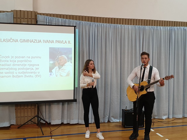 Drugi dio svečanog vodili su maturanti Julia Kršlović Babić i Šimun Janjić, a prva točka pripala je školskom zboru pod vodstvom prof. Grge Ivkovića s pjesmom „Prva ljubav” kantautorice Romane Bilaver. Slijedilo je obraćanje ravnatelja don Ante Sorića i njegovo isticanje lika Ivana Pavla II. koji je iznad svega u svom učenju i obraćanju drugima pozivao na kulturu života i međusobno poštivanje. „Kultura života proizlazi iz strahopoštovanja prema Stvoritelju, a očituje se u poštovanju svega stvorenoga s posebnim naglaskom na poštovanje dostojanstva svake osobe. Upravo zato po njegovim riječima „katolička škola, u svojoj odgojno-obrazovnoj djelatnosti, pozvana je odgovoriti na potrebu konkretne osobe koja je izvor neslućenih mogućnosti i potencijala kako učenika tako i profesora.“