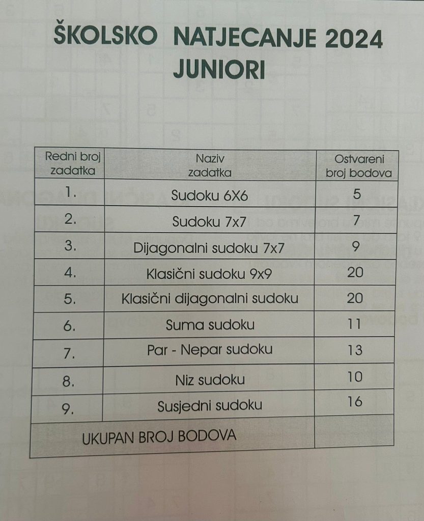 Na ovogodišnjem natjecanju u sudoku sudjelovala su čak 92 učenika iz Zadra, među kojima je bilo i 16 učenika iz naše škole. S ponosom objavljujemo da je naša Paula Tumpa, učenica 3. a razreda, osvojila prvo mjesto i ostvarila plasman na regionalno natjecanje koje će se održati 23. studenog 2024.