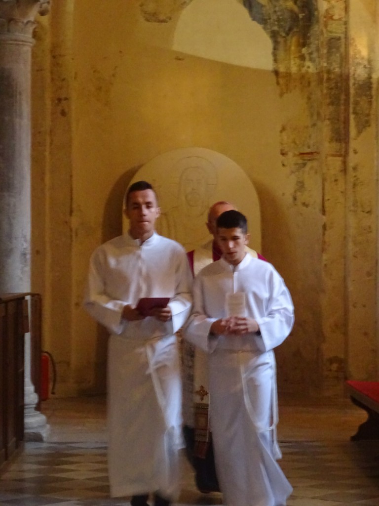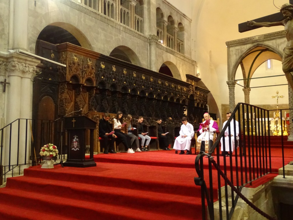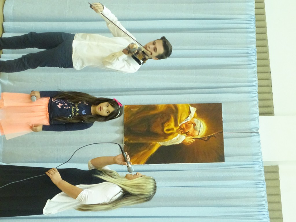 Slavlje smo započeli u katedrali svete Stošije moleći jutarnju molitvu u čast svetog pape Ivana Pavla II. koju su predmolili učenici, a sudjelovao je također i o. nabiskup mons. Želimir Puljić te nam je u kratkoj homiliji prikazao lik svetog Pape. Nakon zajedničke molitve uputili smo se u školsku dvoranu gdje se nastavio program. Početak programa uveličali su članovi obitelji Nikić, majka Anita i sestra Nika uz violinsku pratnju brata Nike, učenika 1. a razreda.