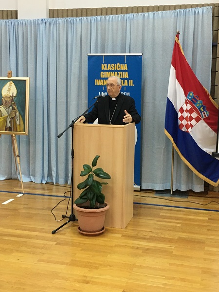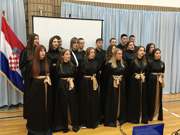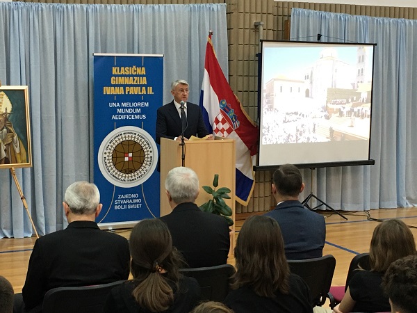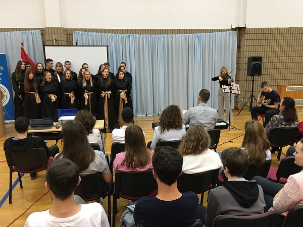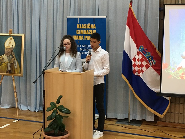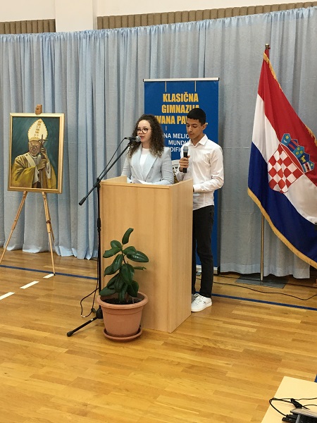 »Ne boj te se! Otvorite širom vrata Kristu!« poziv je cijelom svijetu kojim se papa Ivan Pavao II. obratio narodu na Trgu sv. Petra i započeo svoj pontifikat. Upravo tim istim riječima započeo je drugi dio programa našega slavlja. Prigodni program odvijao se u školskoj dvorani, gdje je školski zbor pod vodstvom profesora glazbene umjetnosti, Grge Ivkovića otpjevao Lijepu našu. Zatim su nas pozdravili voditelji Nora Miletić i Roko Pažanin te izrazili dobrodošlicu i uputili nas u program koji će se odvijati u sljedećih nekoliko sati.