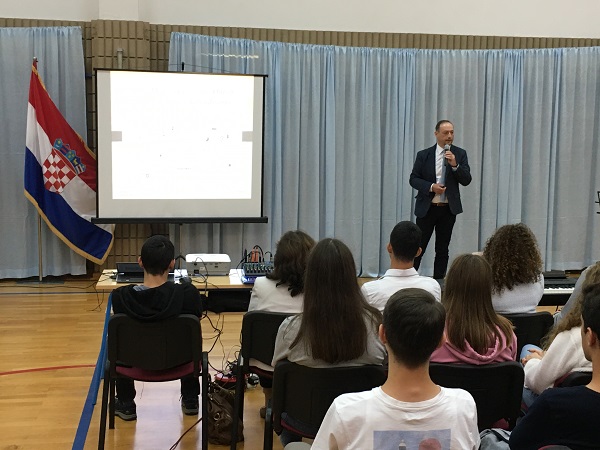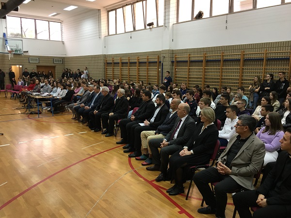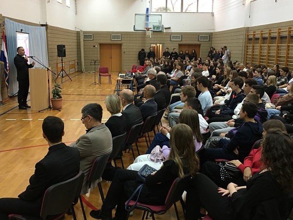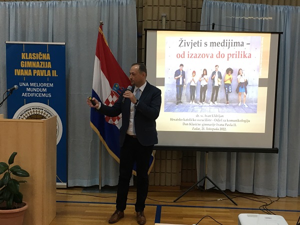 Zajedno s našim ravnateljem don Antom Sorić koji nas je sve toplo pozdravio i prvašima još jednom zaželio dobrodošlicu, prigodan pozdrav uputio nam je i župan Božidar Longin. Uslijedilo je zatim zanimljivo predavanje Živjeti s medijima – od izazova do prilika koje je održao doc. dr. sc. Ivan Uldrijan. Svojom je prezentacijom i izlaganjem potaknuo svih na promišljanje, prikazao je razvoj medijske pismenosti i komunikacijske kulture te nam je dao smjernice kako i na koji način pristupati medijima. Uputio nas je na dobre, ali i na loše strane društvenih mreža kojih nažalost ima sve više, a jedna je od njih cyberbullying, točnije virtualno zlostavljanje. Činjenica kako mladi provode 24 sata tjedno na društvenim mrežama svih je zabrinula, no tijekom predavanja bilo je i šale i smijeha jer je doc. dr. sc. Ivan Uldrijan prigodnim karikaturama i anegdotama osvježio svoje predavanje.