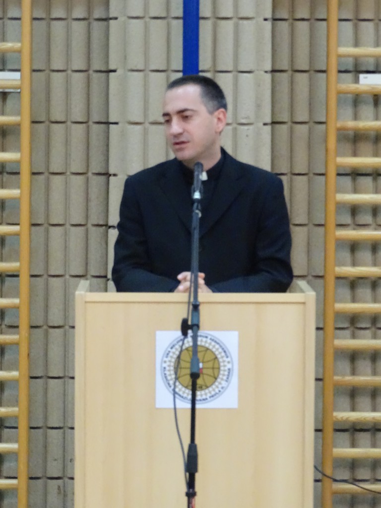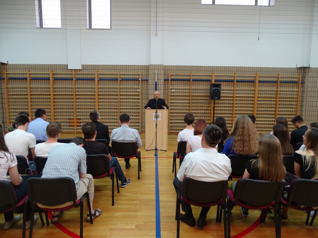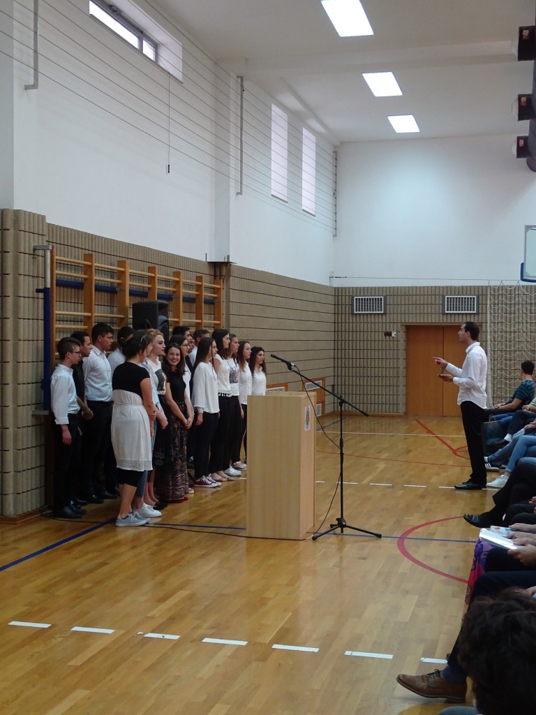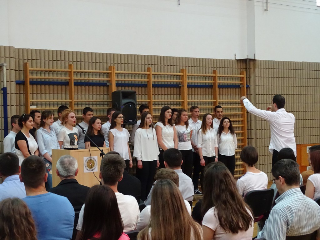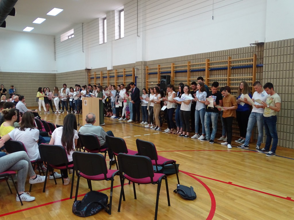 Nakon euharististijskog slavlja ispunili smo prostor školske dvorane u kojoj je slijedio svečani program podjele svjedodžaba maturantima. Svečanost je otvorio školski zbor izvedbom pjesme Tebe tražim pod ravnanjem profesora Grge Ivkovića. Mikrofon su zatim u svoje ruke preuzeli voditelji, naši trećaši: Martina Vidaić i Krunoslav Grebenar. Prvo su zahvalili zboru, a zatim najavili ravnatelja don Antu Sorića koji je zahvalio maturantima istaknuvši njihovu generaciju posebnom, punom raznih talenata i odličnih učenika. Bio je dvije godine njihov ravnatelj, ali brzo su ušli u njegovo srce. Pozdrave maturantima svojim je govorom uputio i nadbiskup mons. Želimir Puljić, naglasivši kako su im svjedodžbe preporuke za daljnje obrazovanje u kojem i dalje trebaju razvijati kršćanske vrjednote. Pohvalio je također školski list Bolji svijet u kojem se predstavljaju i učenici i profesori naše škole.