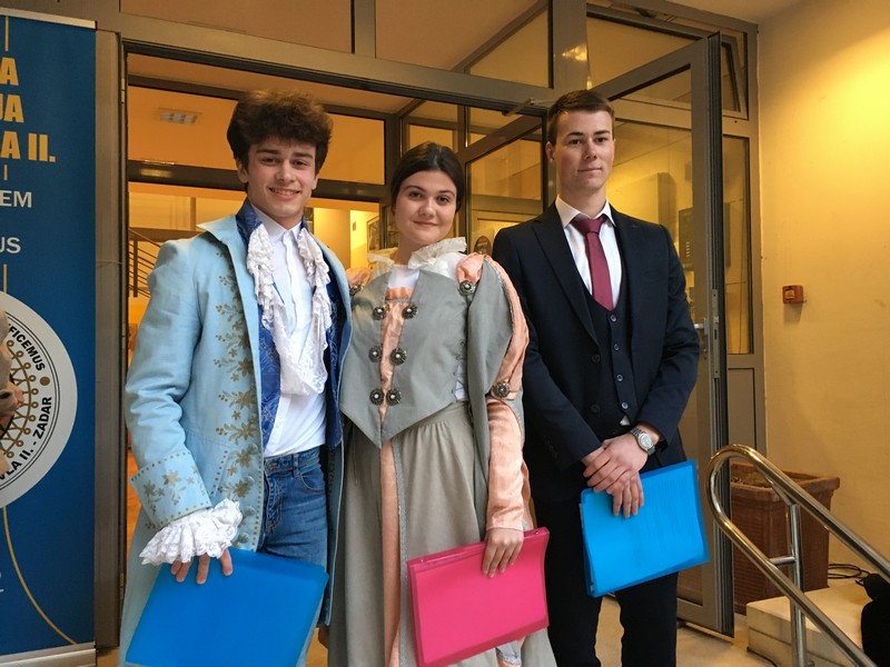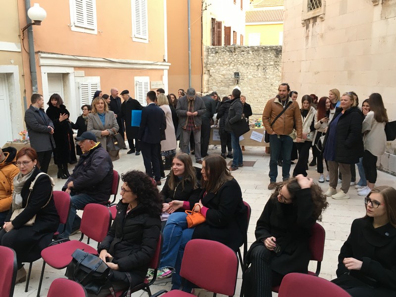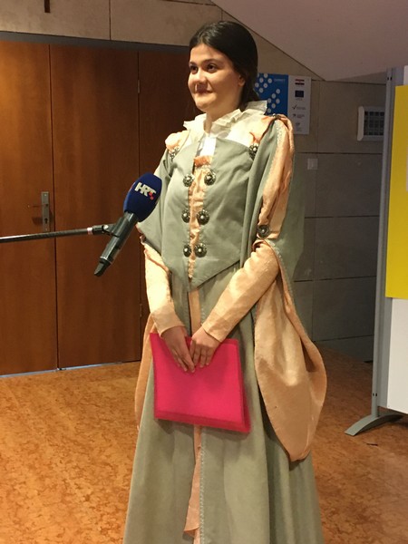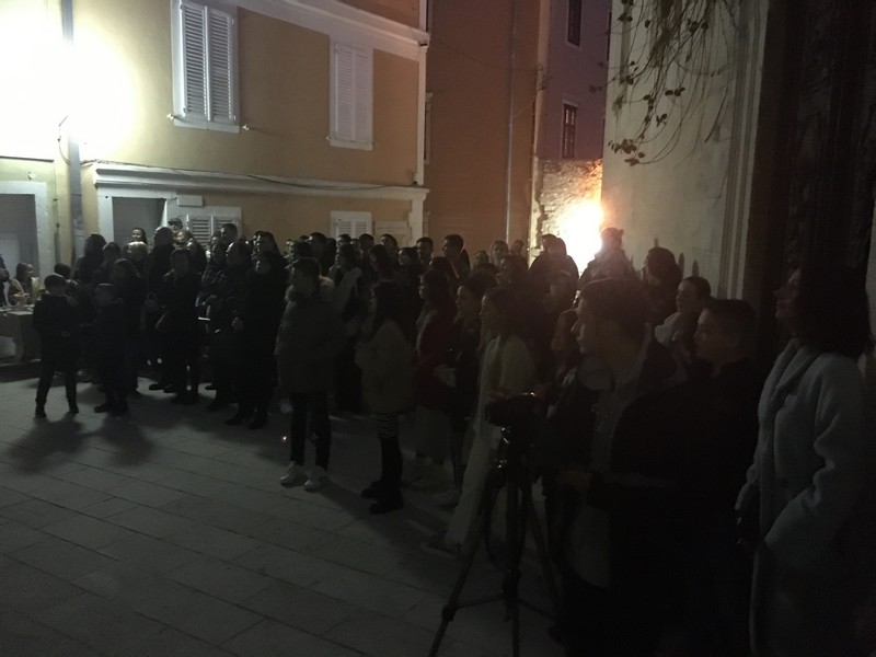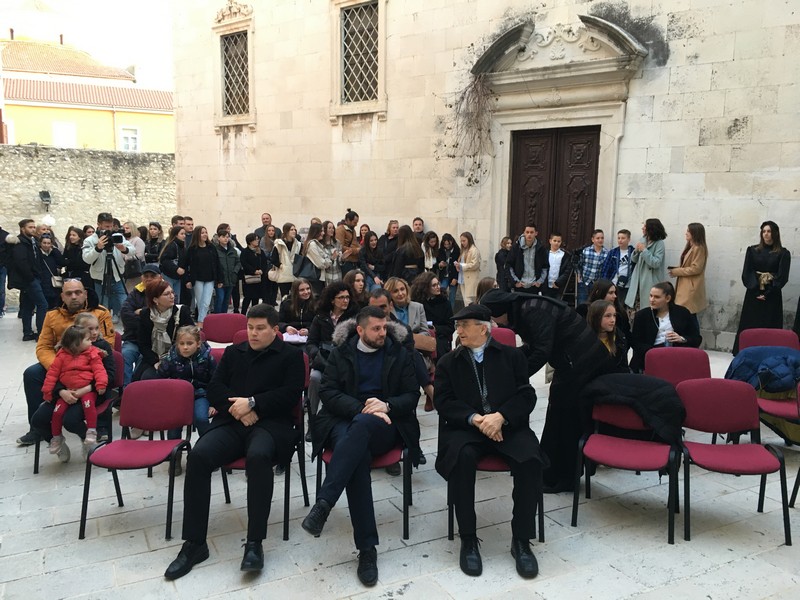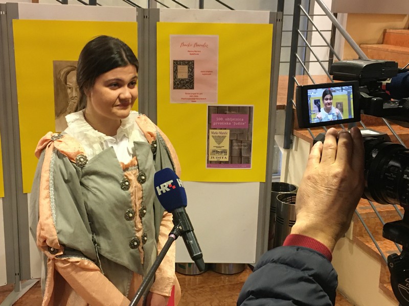 Kao što se i priliči, sve je započelo himnom Republike Hrvatske koju je izveo školski zbor pod ravnanjem prof. Grge Ivkovića nakon čega smo začuli glas glumca Josipa Gende i njegovu izvornu interpretaciju posvete na početku Judite. Nika Radetić i Petar Lisica sigurno su i spretno vodili cijelu večer prigodno odjeveni u renesansne kostime, a njima se u nekoliko navrata pridružio i Karlo Škifić, tako da smo ovom prigodom imali zapravo voditeljski trio. Još su jednom naglasili zašto je Marko Marulić toliko značajan za Hrvatsku, ali i za cijeli svijet te objasnili zašto je i Zadar Marulićev grad. Naime, baš u našoj Znanstvenoj knjižnici čuva se jedan od dva preostala prvotiska Judite iz 1521. godine, stoga će se i godina Marka Marulića svečano zatvoriti 21. travnja u Zadru.