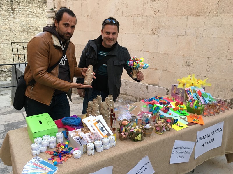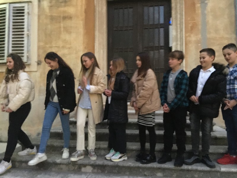 Na scenu sada stupaju naši učenici, začuli smo prvo stihove Marulićeve Molitve suprotive Turkom koju je govorio Niko Nikić i to ni manje ni više nego prozor same škole što je nagnalo sve goste da podignu glave i potraže Niku. Odličan efekt koji se izvrsno uklopio u atmosferu same večeri i prelijepog prostora na trgu pred školom. Nakon dojmljive Nikine izvedbe sve nas je svojim nastupom oduševio Petar Brnin koji je krasnoslovio dijelove Judite – uvjerljivo. autentično, snažno! Bravo, Petre! Svima je to bilo veliko iznenađenje, osim onih koji su ga gledali sedam dana ranije na županijskom LiDraNu.