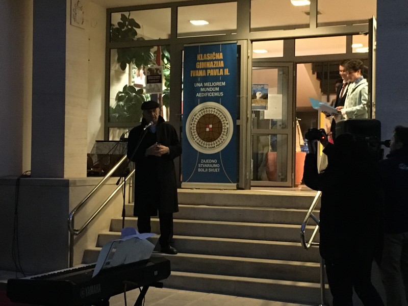 Otac hrvatske književnosti – Marko Marulić pohodio nas je u utorak, 22. ožujka ove godine u Klasičnoj. Zapravo, došao je točno u 18 sati na Trg serdara Stojana Jankovića, na otvoreni prostor ispred školske zgrade. O čemu se doista radi? Naime, Večer Marka Marulića vrhunac je međupredmetnog i interdisciplinarnog projekta Marko Marulić – hrvatski  i svjetski stvaralački genij u kojem su sudjelovali učenici i profesori Klasične gimnazije Ivana Pavla II. još od početka drugoga polugodišta. Sva svoja saznanja i radove o Marku Maruliću učenici su prikazali na školskoj izložbi i završnoj svečanosti povodom obilježavanja 500. obljetnice prvotiska Marulićeve Judite. Na svečanosti su sudjelovali i učenici Katoličke osnovne škole Ivo Mašina.