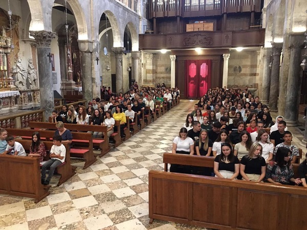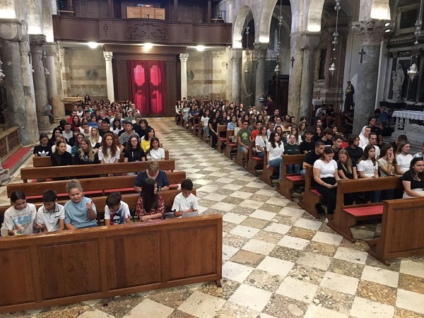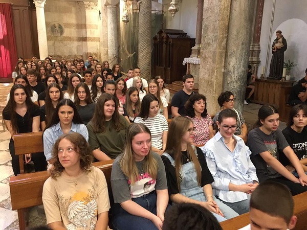 Stigla je nova školska godina, a najljepši način za započeti ju slavljenje je svete Mise. Nakon prvog tjedna škole, u ponedjeljak, 11. rujna, u 8:15, okupili smo se u katedrali sv. Stošije. Katedrala je, malo reći, bila ispunjena jer su uz nas, gimnazijalce, profesore i djelatnike naše škole, bili i učenici predstavnici Katoličke osnovne škole »Ivo Mašina«. Svetu misu predslavio je zadarski nadbiskup Milan Zgrablić uz suslavitelje don Antu Dražinu, našeg ravnatelja, don Rolanda Jelića, ravnatelja Katoličke osnovne škole »Ivo Mašina« te don Marija Karadakića.