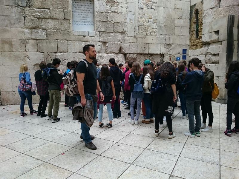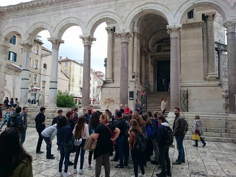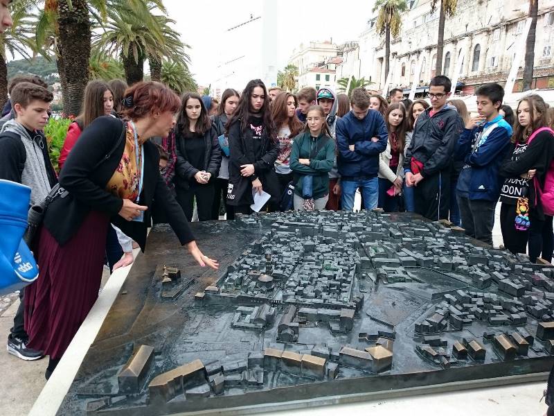 U Split smo došli sa sitnim zakašnjenjem no prvo je na redu bilo slobodno vrijeme tijekom kojeg smo se raspršili po centru grada. Svi smo se ponovno sastali kod makete Splita, na gradskoj rivi, gdje smo upoznali Jelenu. Predstavila nam se kao naš splitski vodič te nam ispričala detaljnu i opsežnu povijest o nastanku Splita.