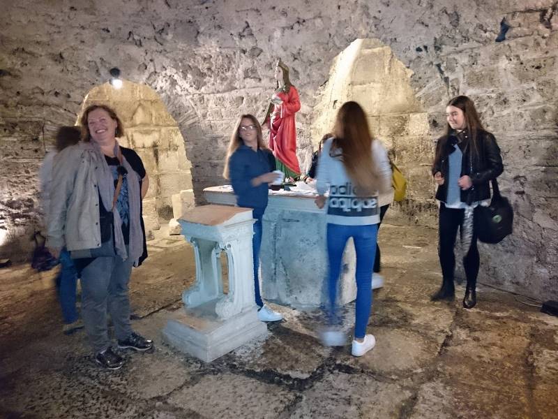 Izišli smo na Peristil, dok nam je vodička obraćala pozornost na egipatske detalje zbog Dioklecijanove ljubavi prema egipatskoj kulturi. Spustili smo se u kapelicu svete Lucije gdje se nalazio oltar i njezin kip oko kojeg posjetioci ostavljaju poruke i molitve pisane na različitim jezicima i pismima pa su i neki od nas ostavili svoje ispisane papiriće.