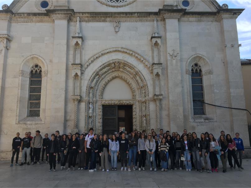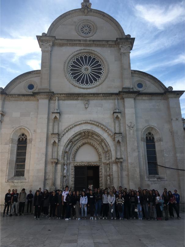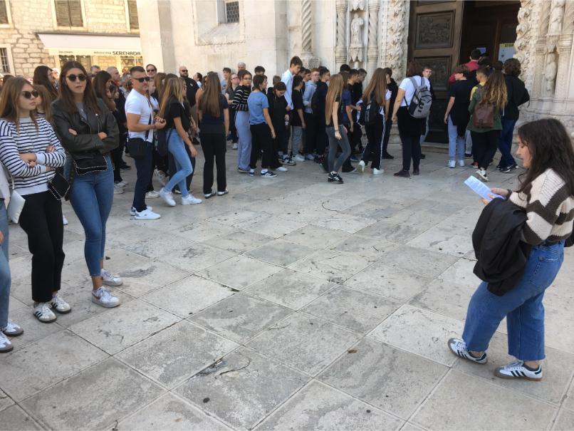 Oko 9 sati stigli smo u Šibenik i uputili se prema katedrali sv. Jakova. Naša »turistička vodička«, Paula Kalcina iz 3.a, s puno nam je entuzijazma podijelila zanimljivosti o ovoj izuzetno važnoj katedrali. Kao pravi vodič, i to pred samom Katedralom, Paula ju je izvrsno opisala kao najznačajnije graditeljsko djelo 15. i 16. st. u Hrvatskoj. Objašnjavala je da je katedrala izgrađena u cijelosti od kamena, bez drvenih elemenata, i da je prva građevina u Europi sagrađena prema principu utorenih ploča. Glavni graditelji katedrale, Juraj Dalmatinac, koji je uveo monumentalne promjene, i Nikola Firentinac, koji je završio gradnju, također su dobili svoje mjesto u njenom izlaganju. Paula je svoje izlaganje završila opisom jedne od najistaknutijih značajki Katedrale, a to je krstionica! Ona predstavlja sintezu kasne gotike i rane renesanse. Za kraj, nadodala je kako je Katedrala poznata po frizu od 74 skulpture glava, što je najbrojnija galerija portreta na sakralnom objektu u Europi.