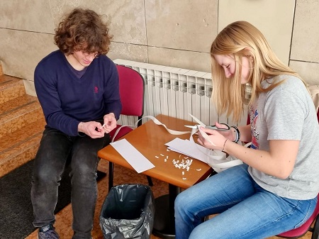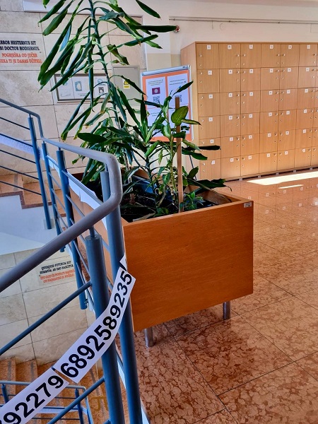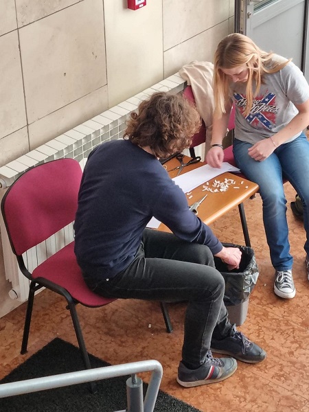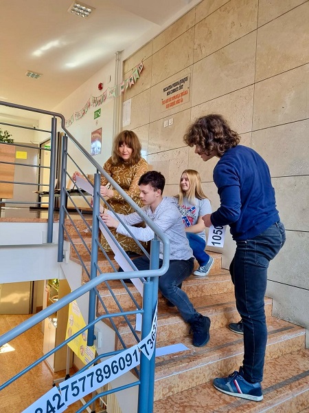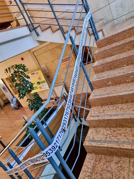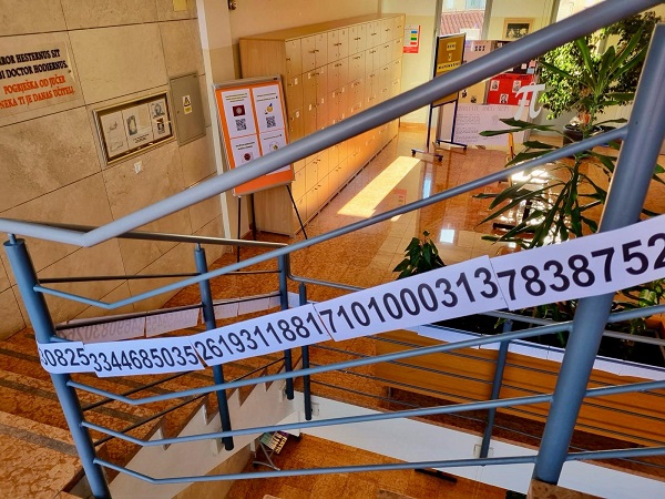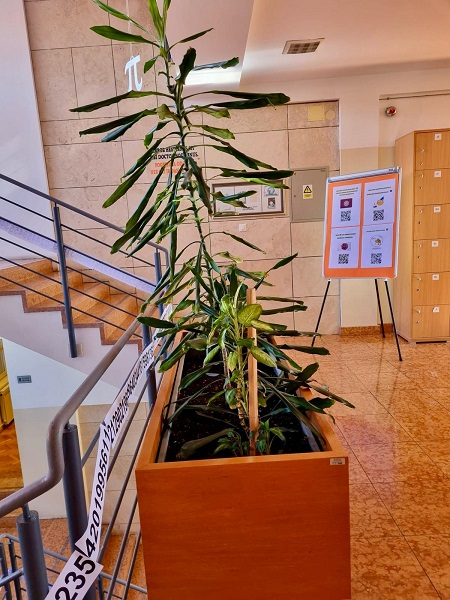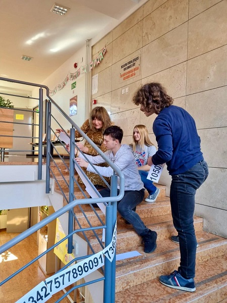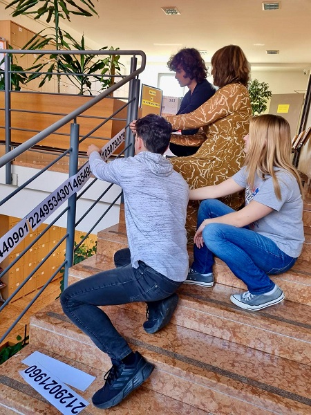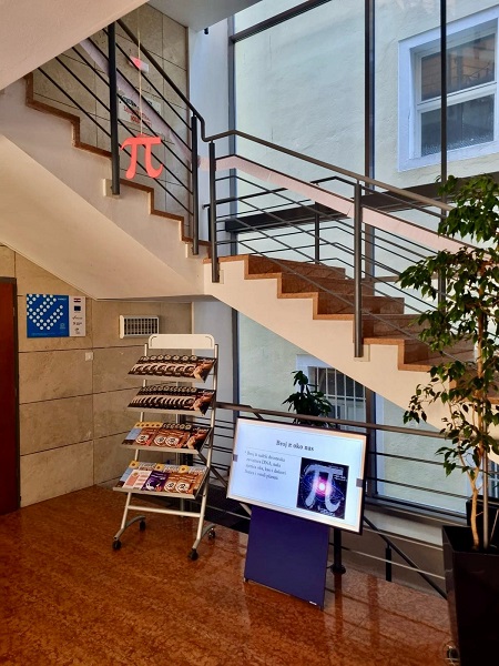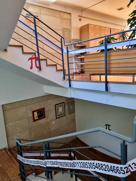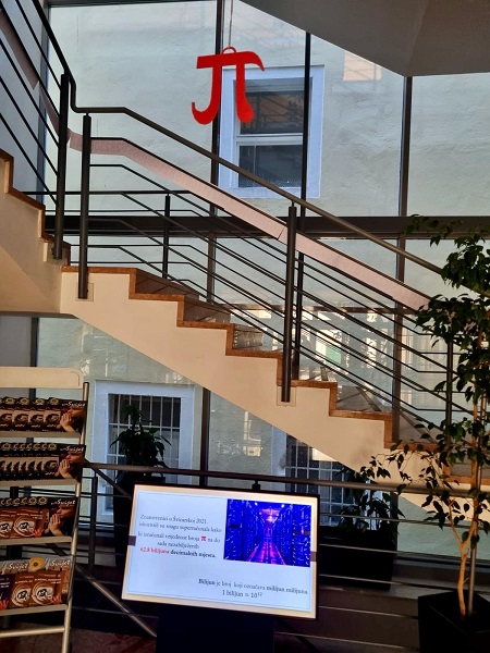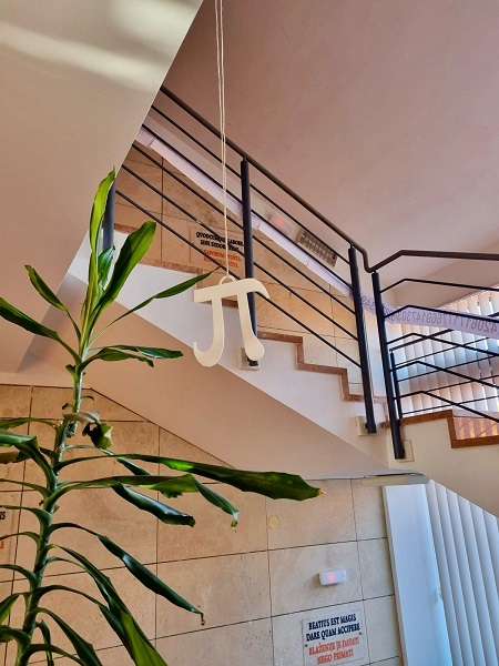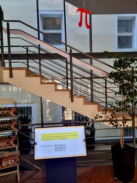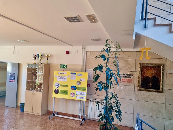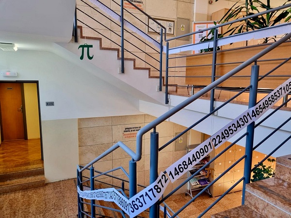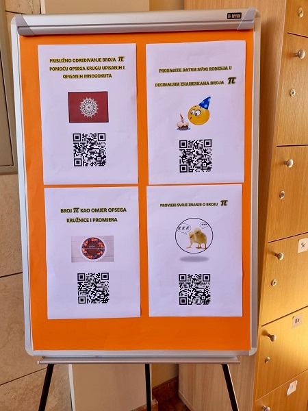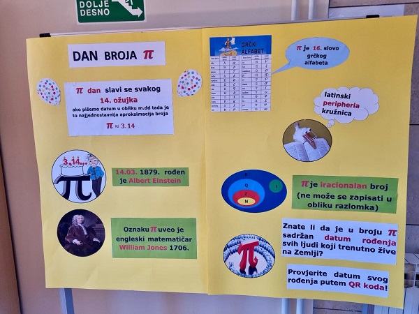 Učenici Martina Mršić 2.c, Klara Marčina 2.c, Karlo Čondrić 4.a i Petar Lisica 4.a pod vodstvom profesorice Sanje Hanžek Bačkov obilježili su dan broja π u našoj školi. Učenice Klara i Martina izradile su plakate (posebno je bio zanimljiv plakat s QR kodovima –pronađite datum svog rođenja u znamenkama broja), a Karlo i Petar izradili su prezentaciju o broju π. Kako bismo dočarali beskonačnost broja, zajedničkim smo snagama, uz dopuštenje ravnatelja, na ogradu stepeništa zalijepili 100 traka s decimalama broja π (svaka traka ima 10 decimala) pa smo tako na ogradu škole uspjeli zalijepiti ukupno 1000 decimala broja π. Drago nam je što su učenici bili oduševljeni tom idejom kada su ulazili u školu, a posebno zahvaljujemo profesorici informatike Maji Zuban koja je na 3D printeru isprintala broj u zelenoj, crvenoj, bijeloj i zlatnoj boji, a koji su posebno uljepšali prostor za Dan broja π.