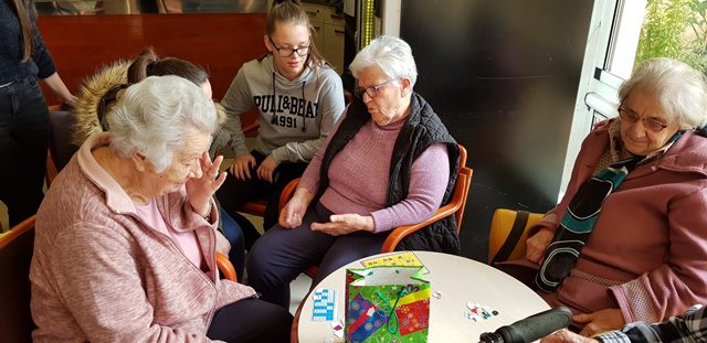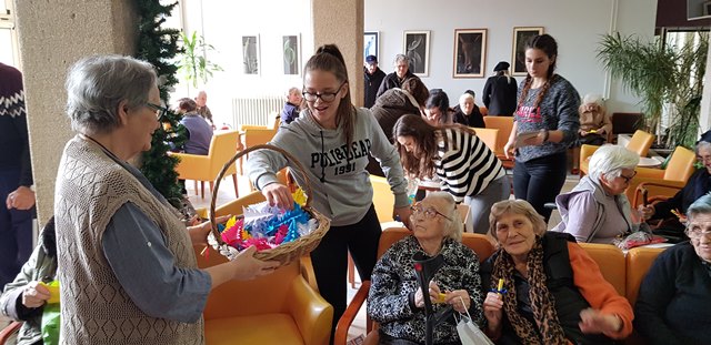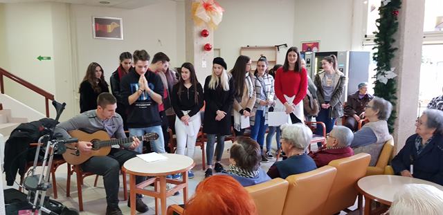 Spremni uljepšati im, a i nama, ovaj dan započeli smo druženje s kratkim igrokazom „Što je za tebe Božić?“ Iz igrokaza je bilo očigledno koliko smo u ovo doba zaokupljeni prolaznim, nebitnim stvarima, i kako vrlo često zaboravljamo na našeg bližnjeg koji gladuje za ljubavlju i toplom riječi. Kako bismo malo podigli atmosferu, Ivan Grganović izvadio je gitaru, zaorila se pjesma… čitav mali koncert predvođen klasičarima. Na repertoaru su se najprije našle božićne pjesme, izabrane od strane nas učenika, a nakon njih kormilo su preuzele bakice kojima nije ni trebala pratnja gitare koliko su veselo i od srca pjevale. Našoj s. Viktoriji posebno se dojmila baka koja je vrlo zdušno zatražila jednu od pjesama Thompsona.