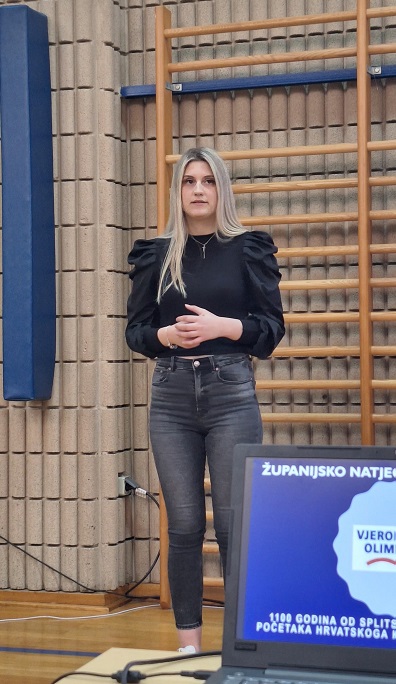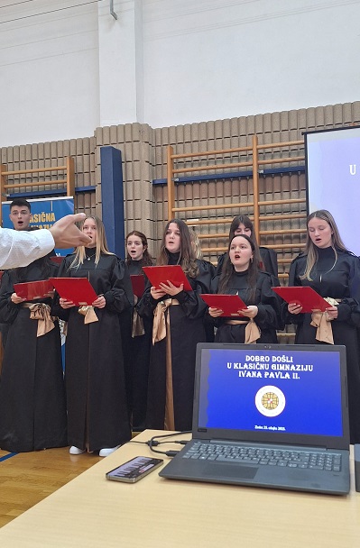 Prije samog natjecanja odnosno Vjeronaučne olimpijade održan je svečani program otvaranja u školskoj sportskoj dvorani. Svečani program otvorio je naš zbor izvedbom himne a potom je naš učenik Petar Barunčić, voditelj programa, uputio svima pozdrave i govor dobrodošlice.