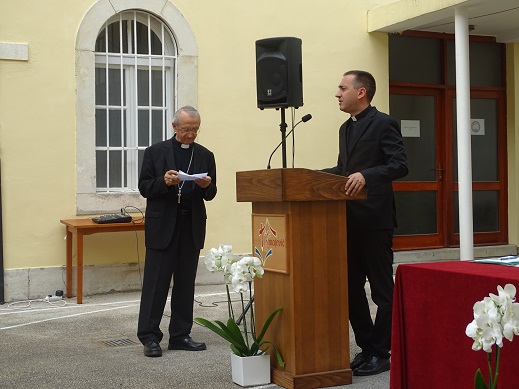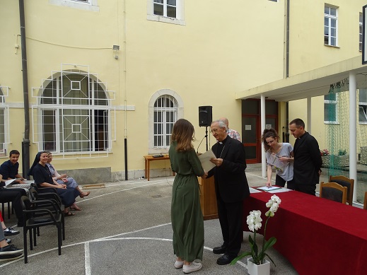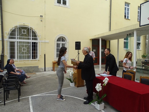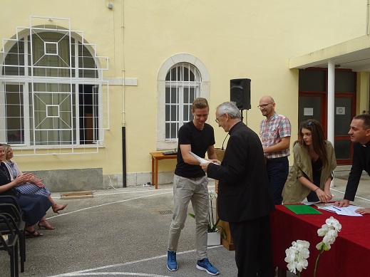 Nakon misnog slavlja uputili smo se u dvorište Sjemeništa na svečanu dodjelu svjedodžbi maturantima. Na početku nam se obratio prof. Damir Sikirić i nakon  kratkog govora slijedila je podjela. Nažalost nisu mogli nazočiti svi maturanti jer su neki od njih pisali ispit državne mature. Bila je ovo zahvala ovogodišnjim maturantima na četverogodišnjem  trudu i želja za sve najbolje u njihovom daljnjem školovanju. Nakon što im je nadbiskup svečano uručio svjedodžbe, proglasio je i najbolji razred ove šk. godine, kriterij je bila urednost i čistoća učionice. Pobijedio je 3. a razred i time osvojio nagradni izlet. Ovo je druga pobjeda istoimenog razreda, u prvom razredu  dobili su nagradu za najmanji broj izostanaka. Proglašenje je popraćeno sveopćom radošću i pljeskom.
