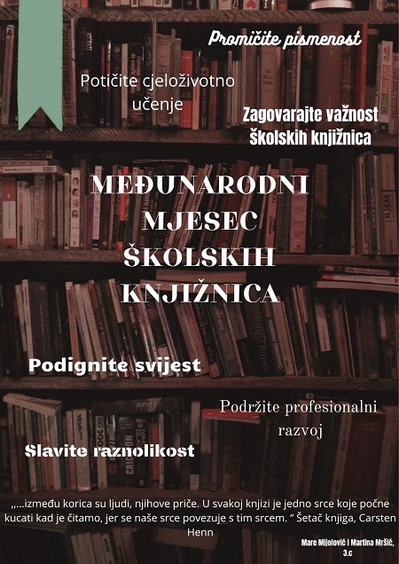Naše učenice iz 3. c, Mare Mijolović i Martina Mršić, izradile su digitalni plakat povodom Međunarodnog mjeseca školskih knjižnica.