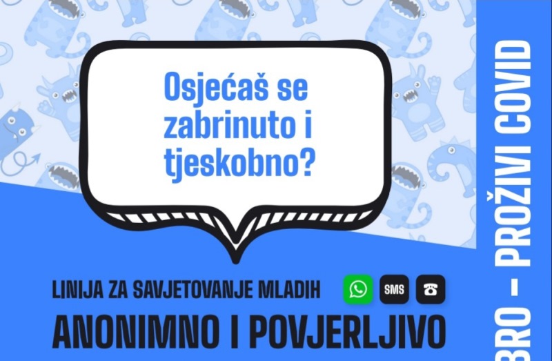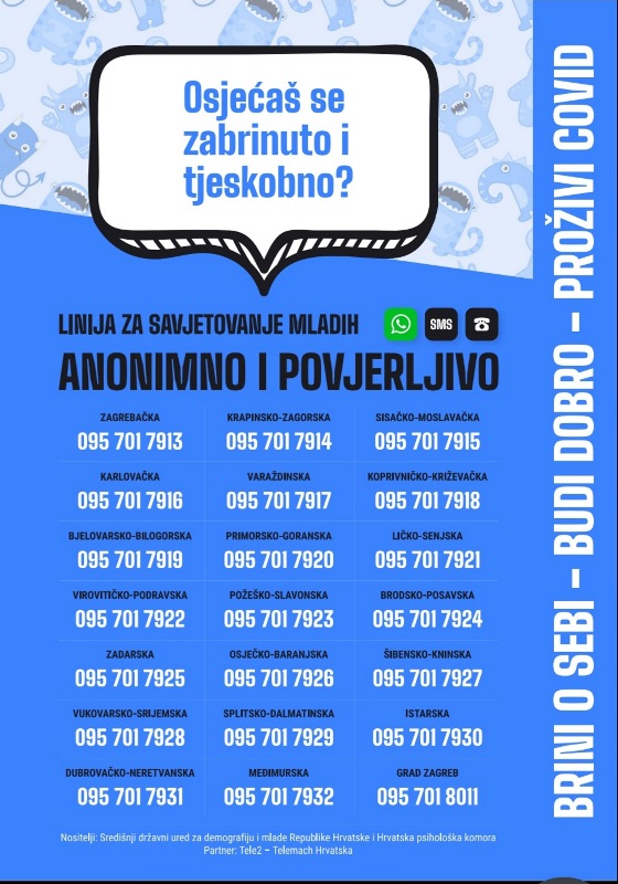 ” Svjesni situacije koje je pred mlade u Hrvatskoj stavila pandemija koronavirusa, te izazova koje je donijelo “novo normalno” željeli smo doznati koji su njihovi najveći problemi, te dobiti izravna saznanja o utjecaju pandemije na njihove živote i mentalno zdravlje. Uvidjeli smo potrebu za sustavnom i stručnom podrškom mladima, te se u suradnji sa Hrvatskom psihološkom komorom pokreću linije za telefonsko savjetovanje mladih. Radi se o sveukupno 21 liniji koje će biti otvorene u 20 hrvatskih županija i gradu Zagrebu unutar projekta “Brini o sebi – Budi dobro – Proživi Covid”. Mladima želimo poručiti kako ih razumijemo, te se nadamo da će im ovaj vid podrške biti jedan od načina za lakše prebrođivanje trenutačne situacije.” – poručila je državna tajnica Središnjeg državnog ureda za demografiju i mlade Željka Josić.
