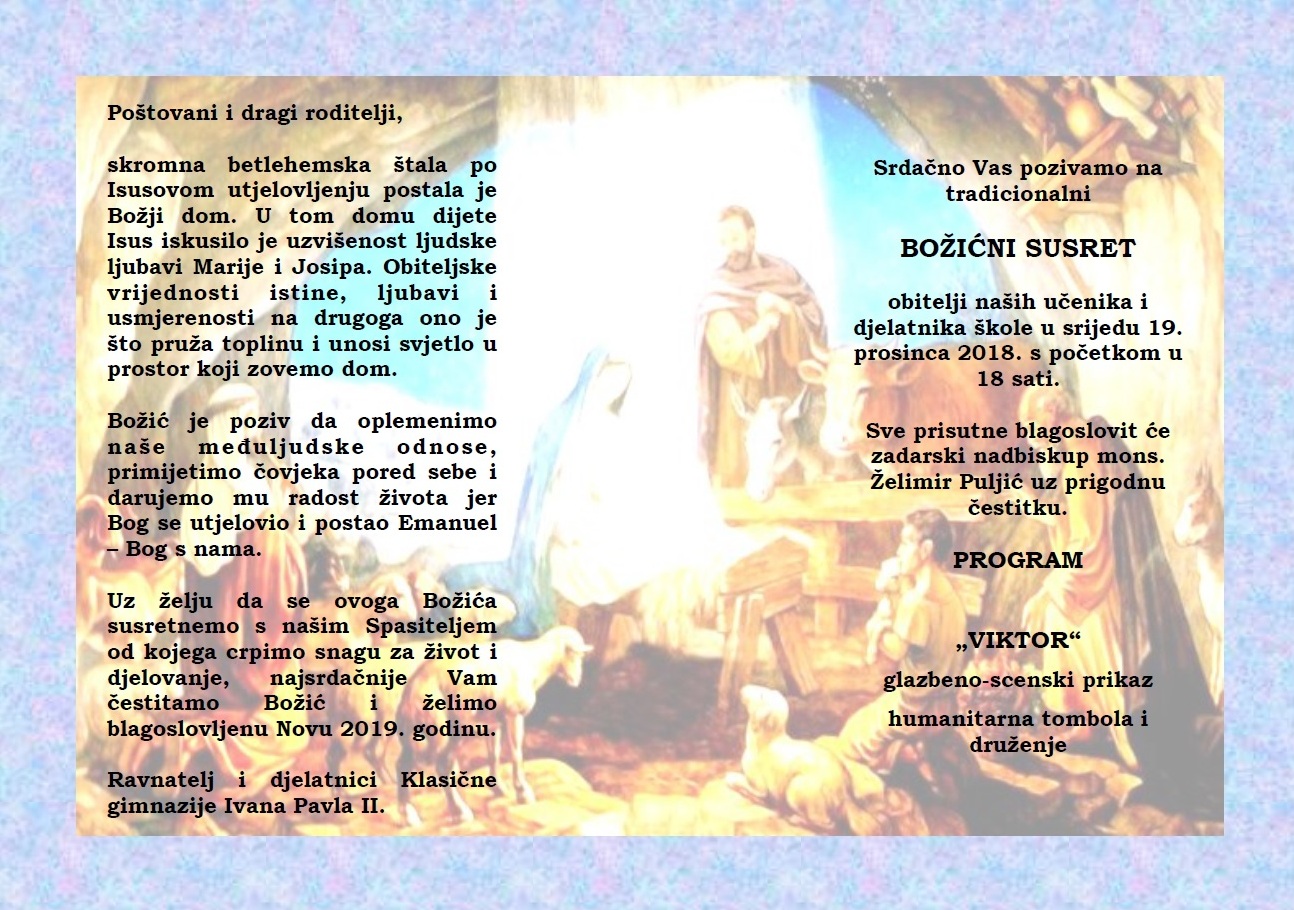 Uz želju da se ovoga Božića susretnemo s našim Spasiteljem od kojega crpimo snagu za život i djelovanje, najsrdačnije Vam čestitamo Božić i želimo blagoslovljenu Novu 2019. godinu.