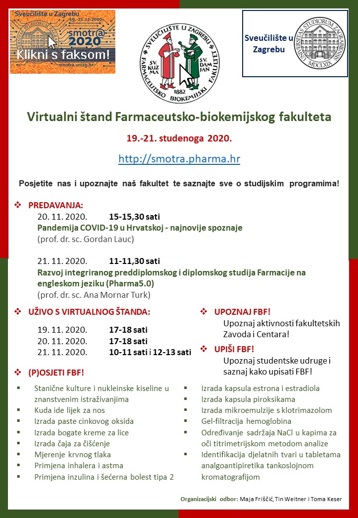 Pozivamo sve zainteresirane da posjete virtualni štand Farmaceutsko-biokemijskog fakulteta na sljedećoj poveznici: http://smotra.pharma.hr te iz prve ruke saznaju sve o studijskim programima Farmacije i Medicinske biokemije i o studentskom životu na Fakultetu u druženjima „uživo“ s našim studentima svakoga dana za vrijeme trajanja Smotre!